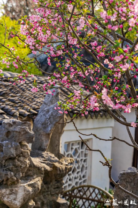 五峰仙馆外、东园一角、曲溪楼旁、又一村内,海棠与假山奇石相映成趣,倚着粉墙黛瓦悄然绽放,为留园增添几分春日柔美。
