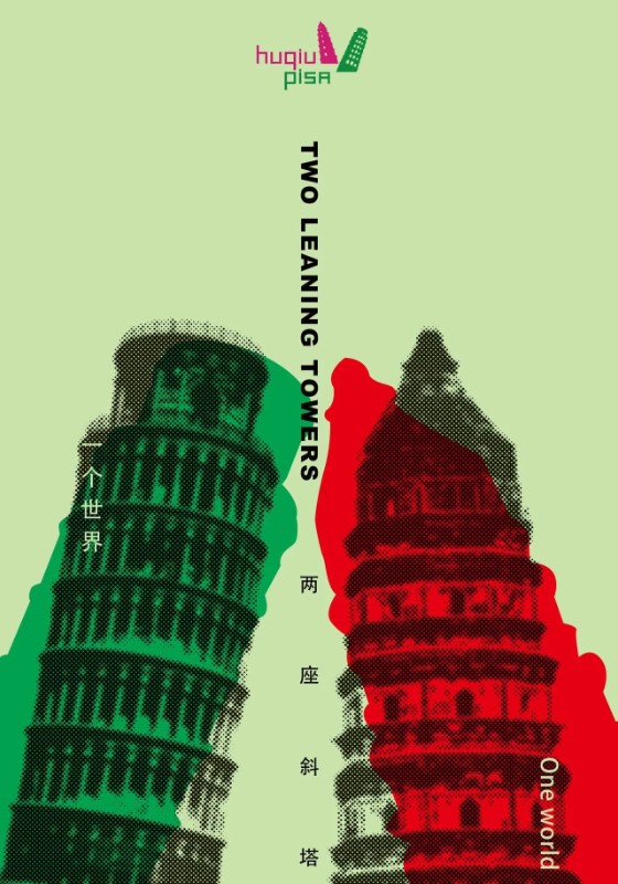 海报设计师们用视觉语言打破了地理界限。有的以意大利国旗绿白红三色为底,中国地图轮廓隐现其间,两座斜塔的剪影并置而立;有的将中国龙的形象与双塔结合,红色背景滚烫热烈,烘托出东方文化的开放姿态;还有的运用泼墨式文字解构重组,穿插感官元素与苏州园林云纹装饰,邀请观众用感官去感受两座塔的相遇。