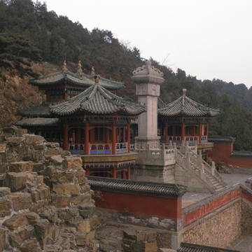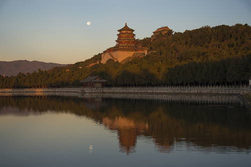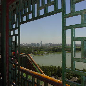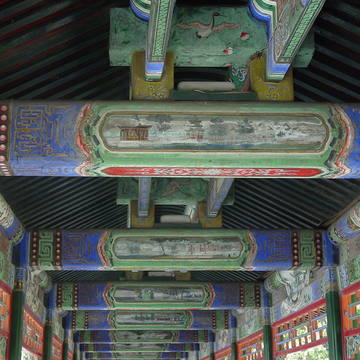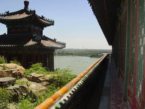 颐和园自万寿山顶的智慧海向下,由佛香阁、德辉殿、排云殿、排云门、云辉玉宇坊,构成了一条层次分明的中轴线。山下是一条长700多米的“长廊”,长廊枋梁上有彩画8000多幅,号称 “世界第一廊”。长廊之前是昆明湖。昆明湖的西堤是仿照西湖的苏堤建造的。