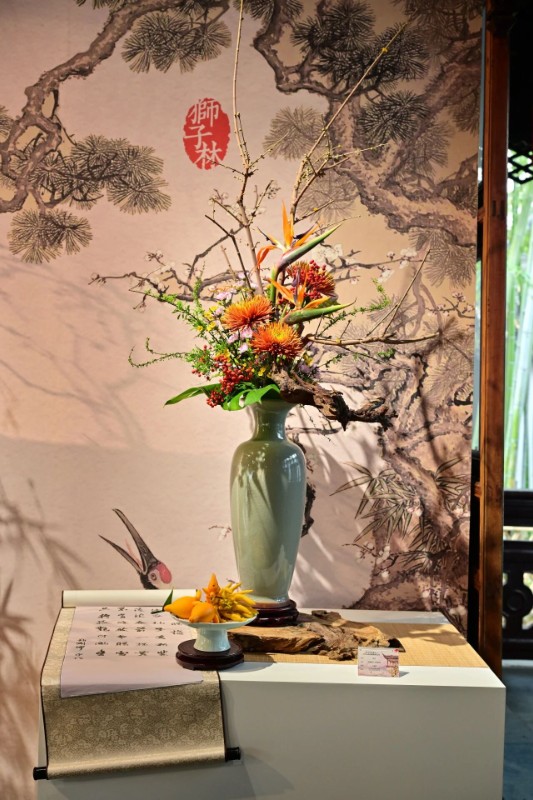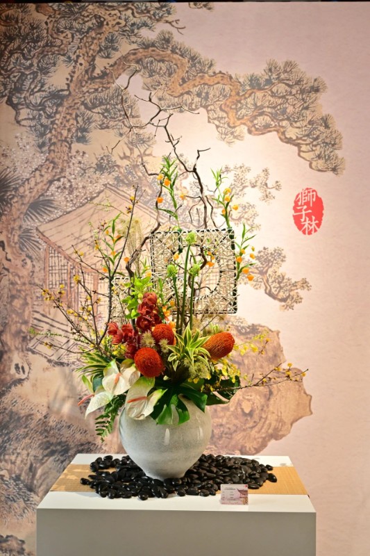作品“岁暮清欢”以竹编宫灯篮为器,甄选蜡梅枝、牡丹菊、跳舞兰为核心花材,配佛手、奇石造景;运用主次相衬、借景生情的传统手法,枝条疏朗托繁花艳色,尽显东方花艺的诗画意境。