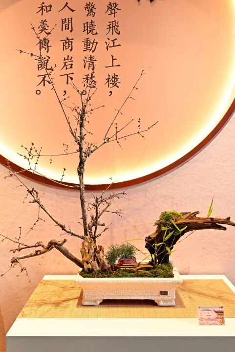 作品“月窗梅影”以粗陶直筒瓶为器,撷取蜡梅枝、洋桔梗、香松、雪柳为材;采用不对称延展、点线结合的手法,枝蔓斜展勾勒灵动线条,色彩雅艳相济,意境疏朗悠远,将东方花艺的写意之美诠释得淋漓尽致。