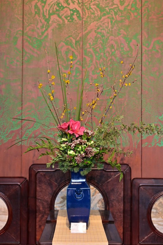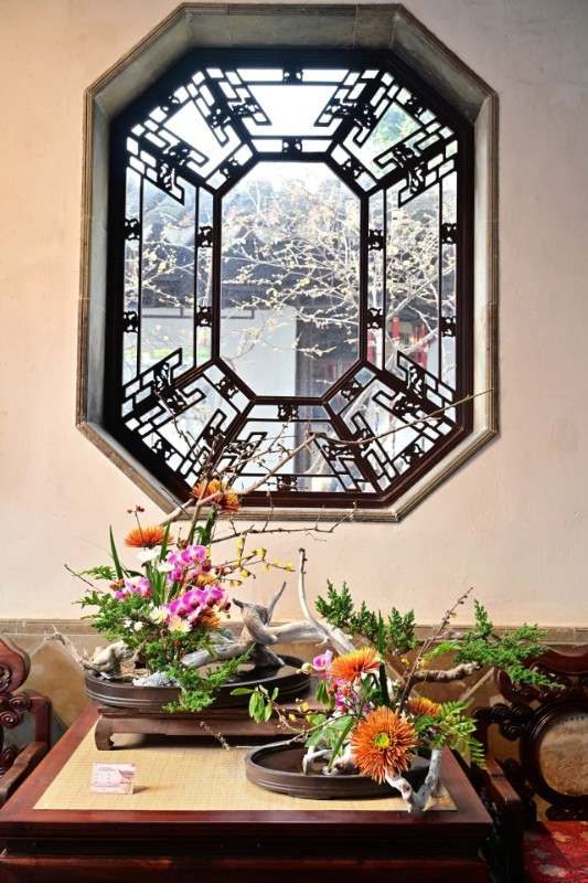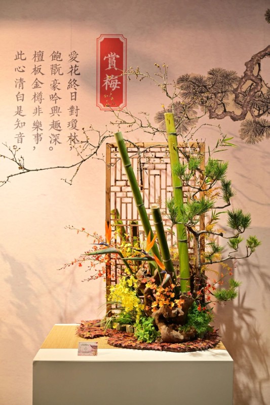 作品“插枝梅花便过年”以红釉小瓷瓶、白瓷彩纹盆为器,撷取马蹄莲、蜡梅枝、枇杷枝为花材;运用双器组景、借窗造境的手法,盆器上的梅花图样搭配福字饰纸添年节意,花艺与园林窗格相映,尽显东方年味与自由花艺的融合。