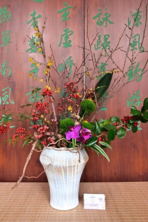 作品“寒荣”以黑釉圆口浅盆为器,甄选竹枝、蜡梅枝、大花蕙兰、牡丹菊为花材;运用高低错落、疏枝取势的传统手法,竹枝高挑展风骨,繁花簇于盆中添艳色,尽显中式花艺的自然生趣。