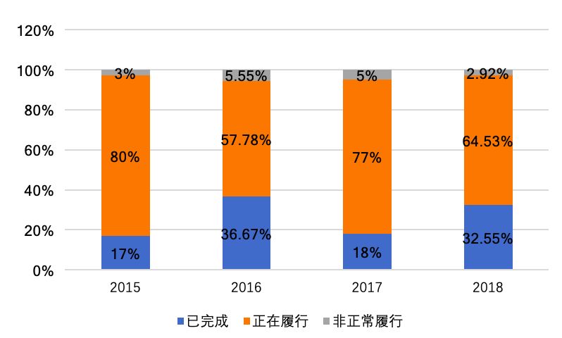 2015-2018年,正常履行(含已完成和正在履行)承诺事项的比例总体上呈逐年增长的趋势,且2018年已完成的比例大幅增长,反映了各遗产地正严格按照《世界遗产公约》的要求,履行作为缔约国该有的责任和义务。