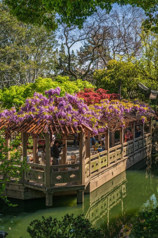 狮子林:姑苏区园林路23号(花园水池南部湖心岛紫藤棚架,与湖心亭对望,4月盛放)