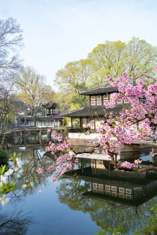拙政园:姑苏区东北街178号(中部池畔、桃花渡一带,桃花映碧波,与亭台倒影交织,是园内赏桃绝佳点位,3月中下旬至4月初盛放)
