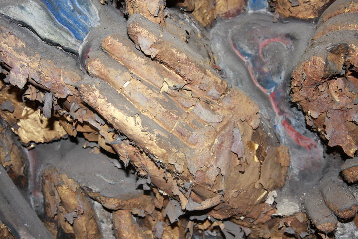上图是去除不稳定金箔后。有没有发现拇指不对劲。拇指是后来泥塑上去的。千手观音的本体是岩体(砂岩)。