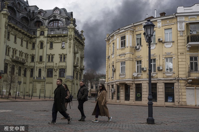 当地时间2022年4月3日,乌克兰敖德萨,人们走在街道上,炮击后烟雾上升。 视觉中国 资料图