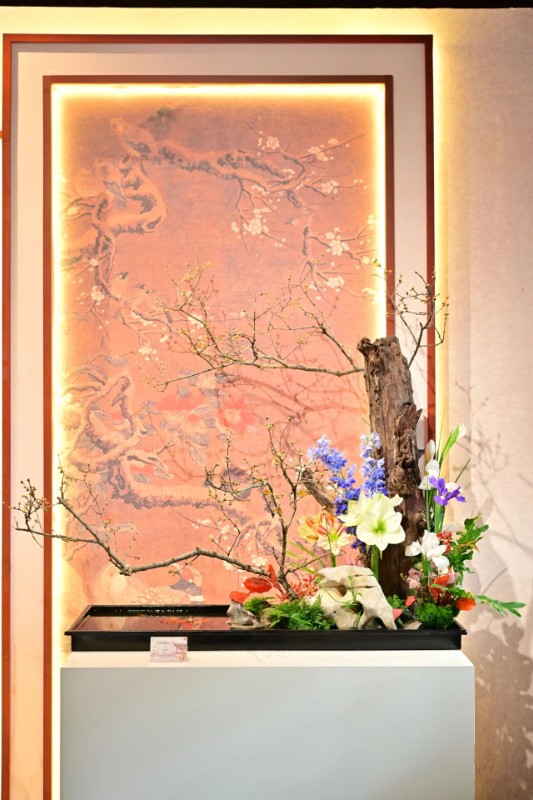 作品“梅昭”以竹编宫灯篮为器,撷取鹤望兰、烟花菊、山茶花、蕨类及蜡梅枝为材,运用疏密对比、起承转合的传统手法,枝蔓斜展衬繁花层次,以写意造景的东方手法,勾勒出苍劲灵动的自然意趣。