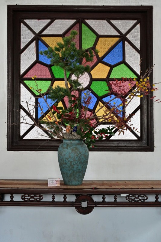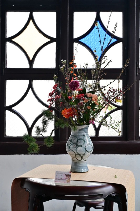 作品“插枝梅花便过年”以红釉小瓷瓶、白瓷彩纹盆为器,撷取马蹄莲、蜡梅枝、枇杷枝为花材;运用双器组景、借窗造境的手法,盆器上的梅花图样搭配福字饰纸添年节意,花艺与园林窗格相映,尽显东方年味与自由花艺的融合。